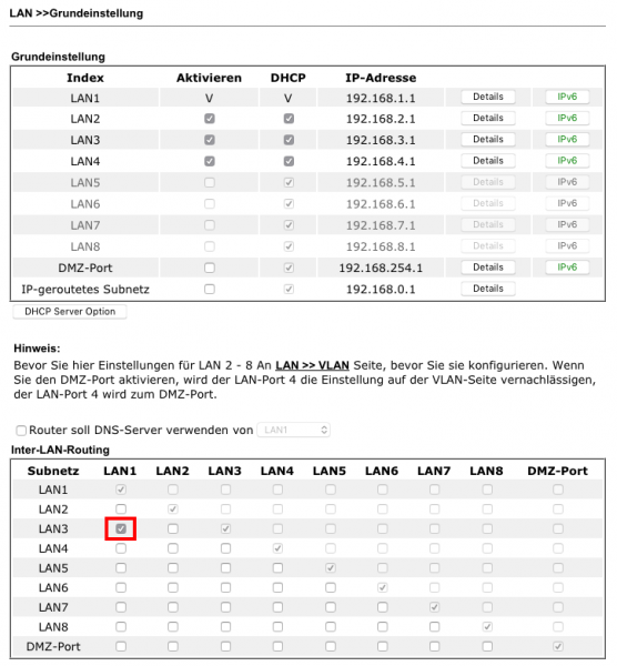 1.) Damit der Zugriff zwischen den internen Netzen grundlegend funktioniert, erstellt man einen entsprechenden Eintrag im Menü „LAN/General Setup/Inter-LAN Routing“